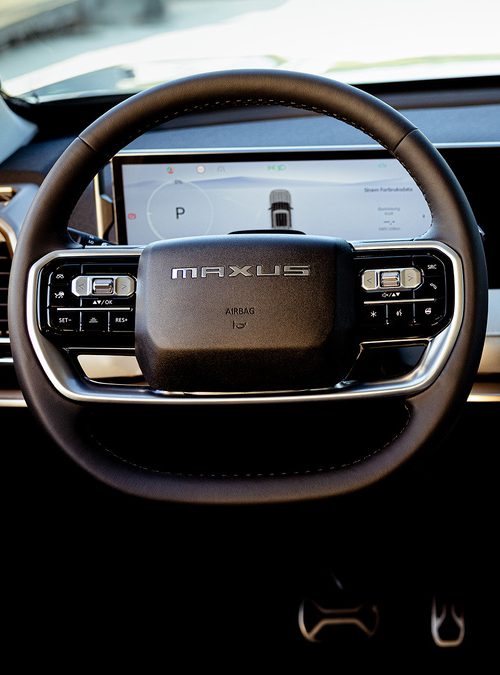 Maxus eTerron 9 kombinerer funksjonalitet og komfort med et stilfullt, moderne interiør. Kupeen er designet for å gi både fører og passasjerer en behagelig og praktisk opplevelse, enten du er på jobb eller på tur. Interiøret er preget av høykvalitets materialer som gir en luksuriøs følelse, med detaljer i kunstskinn og moderne tekstiler. Instrumentpanelet har en stilren og funksjonell layout, med intuitiv tilgang til bilens mange funksjoner.