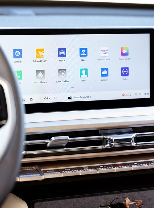 Den avanserte dualskjermen inkluderer en 12,3″ touchskjerm, navigasjon og apple carplay/android auto, og viktige funksjoner styres fra multifunksjonsrattet. Systemet støtter også talestyring.